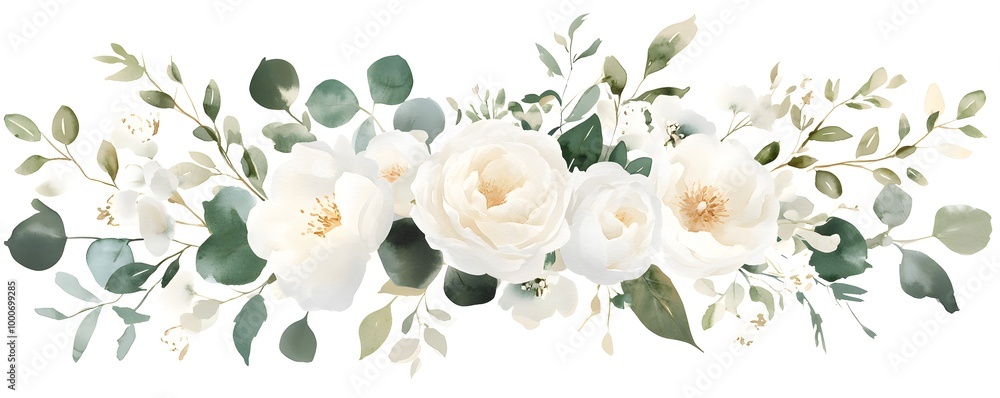 Watercolor Floral Border White Roses with Green Leaves, Flowers, Wedding , Invitation