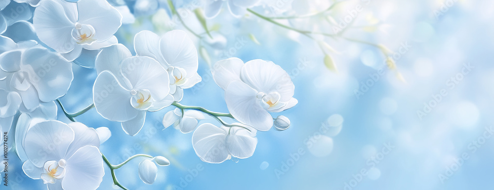 A blue background with white flowers and small bubbles, creating an elegant...