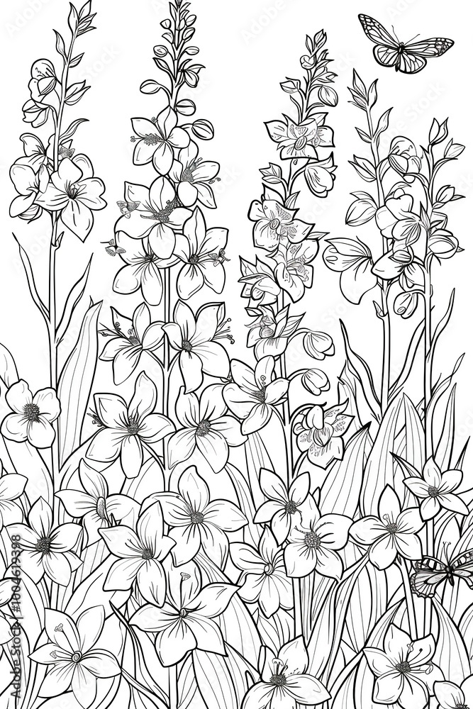 Detailed floral illustration with tall flowers butterflies a Wallpaper