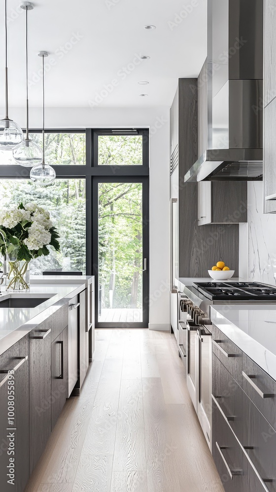 Modern Kitchen With Sleek Cabinets Natural Light And Wallpaper Mural - Decorly Solutions | Decorly Solutions