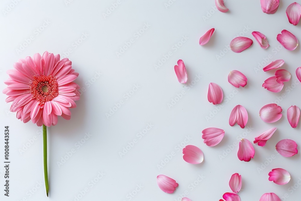 Minimalist flat lay with a pink flower and scattered petals on a clean white surface
