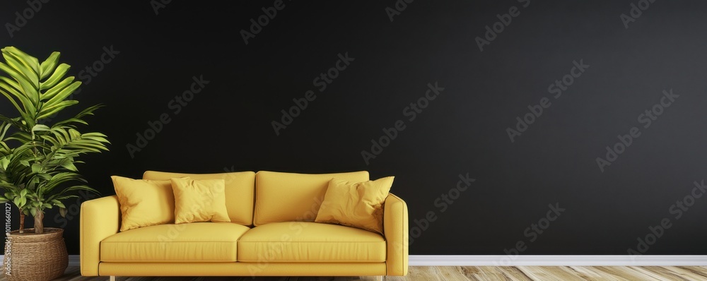 Modern Living Room With Dark Wall And Yellow Wallpaper Mural - Decorly Solutions | Decorly Solutions