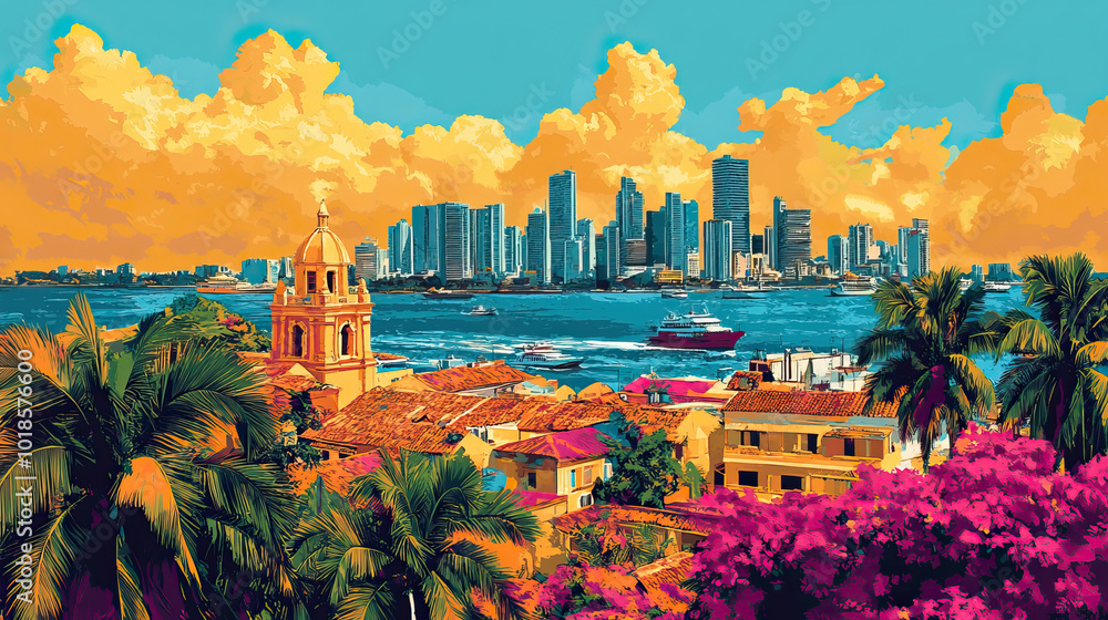 Risograph artsy riso print travel poster, card, wallpaper or banner illustration, modern, isolated, clear, simple of Bridgetown, Barbados