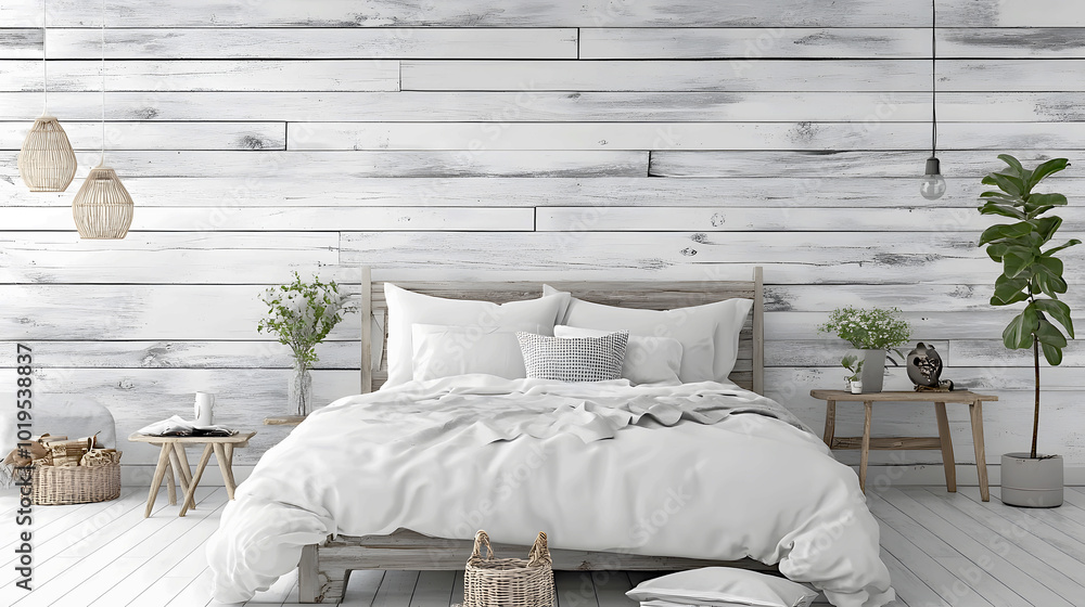 Modern Bedroom with Bright Wood and Vinyl Wall Features Wallpaper