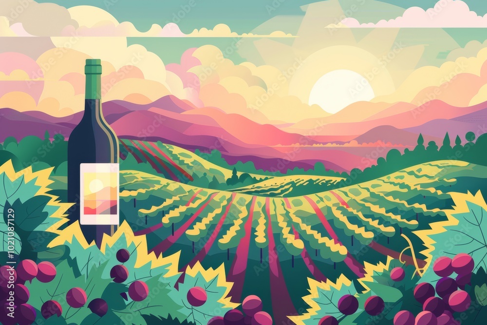Vibrant Vineyard Sunset With Wine Bottle And Grapes Wallpaper Mural - Decorly Solutions | Decorly Solutions