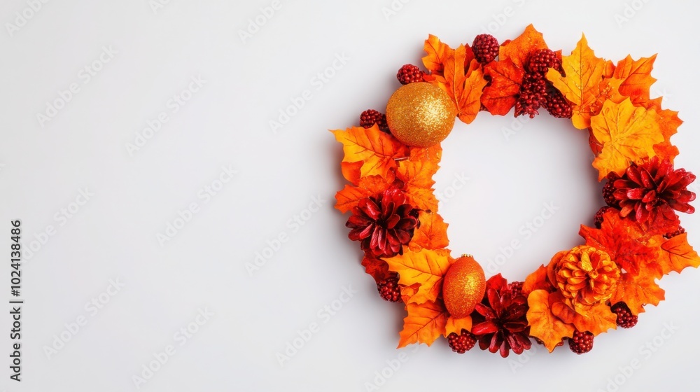 秋の恵みを飾る:ドライリーフとミニパンプキンが彩るリースフレームgenerated Image
