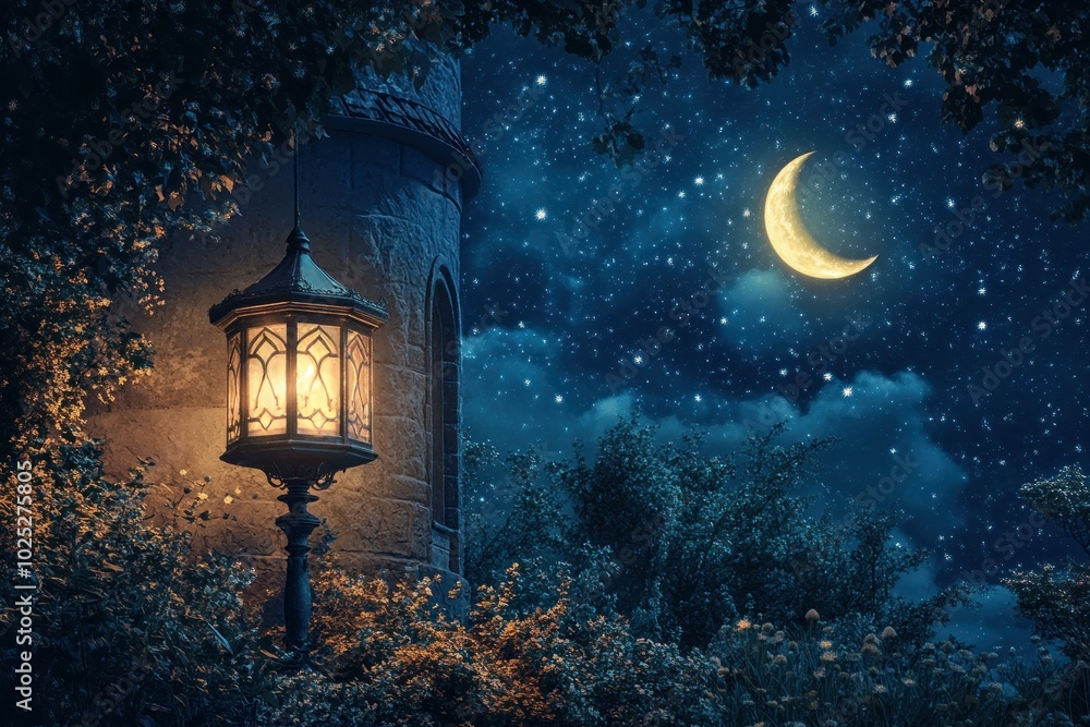 Ramadan Nightscape: A majestic ornate lantern glows warmly under a crescent moon and starry night sky, casting a magical ambiance over a distant landscape of twinkling lights.