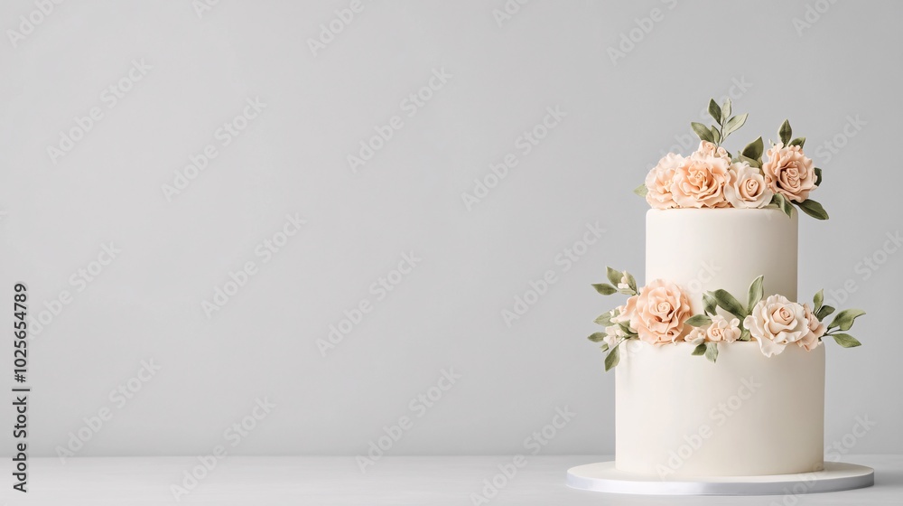 A beautiful two-tier cake adorned with delicate peach roses Wallpaper