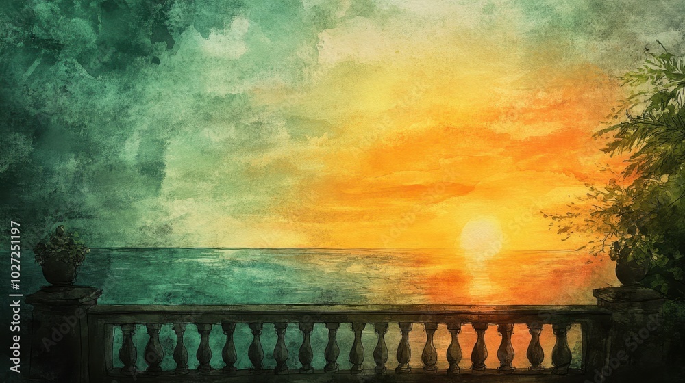 Serene Sunset Overlooking Ocean with Vintage Balustrade Wallpaper