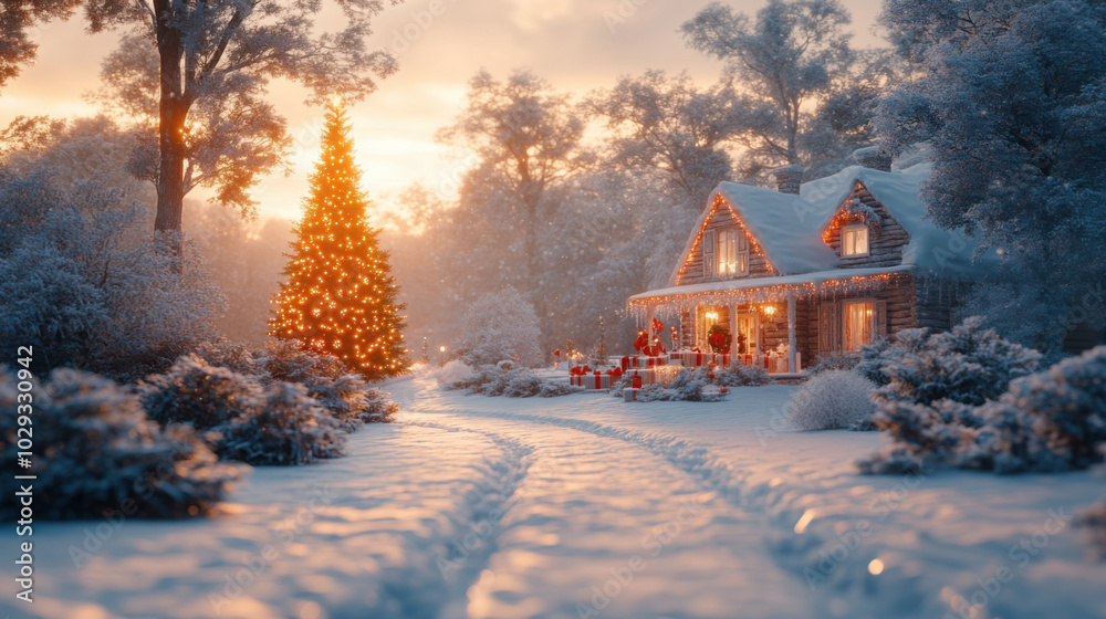 A Snowy Christmas Scene With A House Decorated Wallpaper Mural - Decorly Solutions | Decorly Solutions