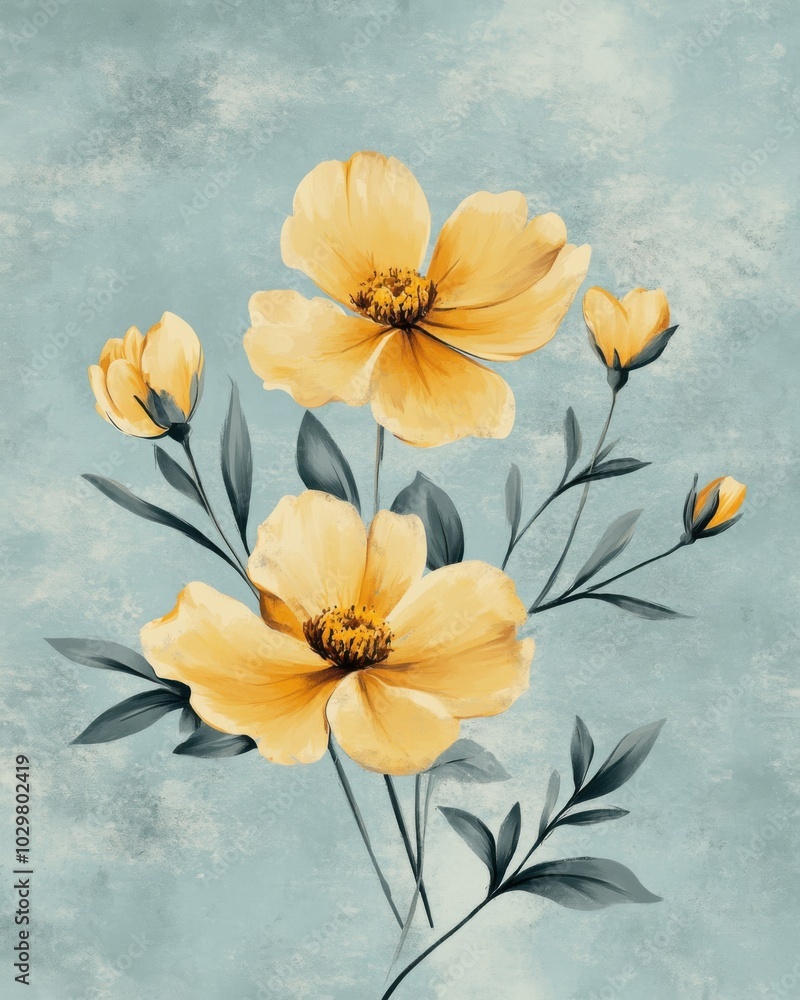 Vintage Inspired Floral Illustration on Soft Blue Background