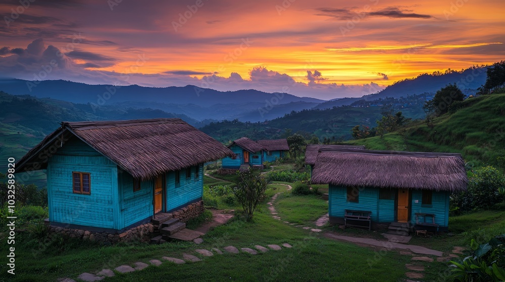 Scenic Sunset Over Traditional Huts In A Lush Wallpaper Mural - Decorly Solutions | Decorly Solutions