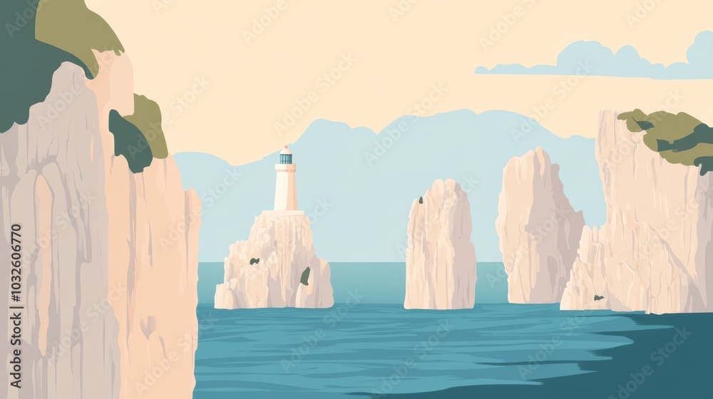 Serene Coastal Lighthouse Scene with Rocky Cliffs and Calm S Wallpaper