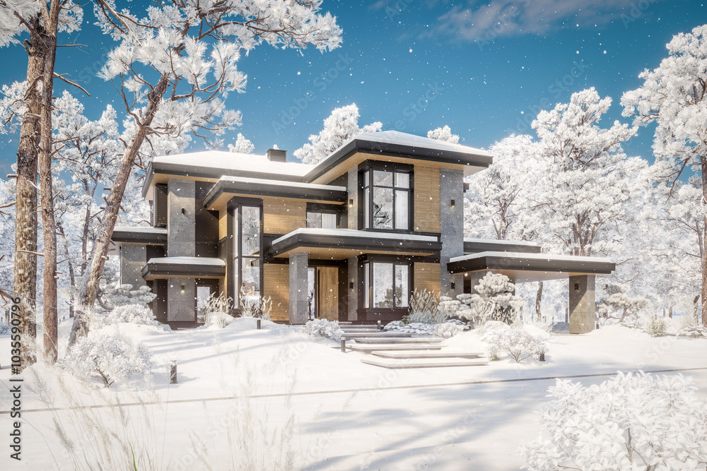 3d Rendering Of Modern Two Story House With Wallpaper Mural - Decorly Solutions | Decorly Solutions