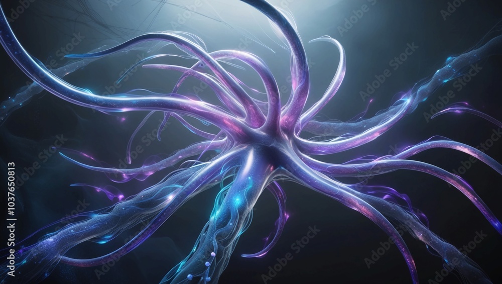 Digital Neural Network with Abstract Connections and Glowing Data Streams in Blue and Purple