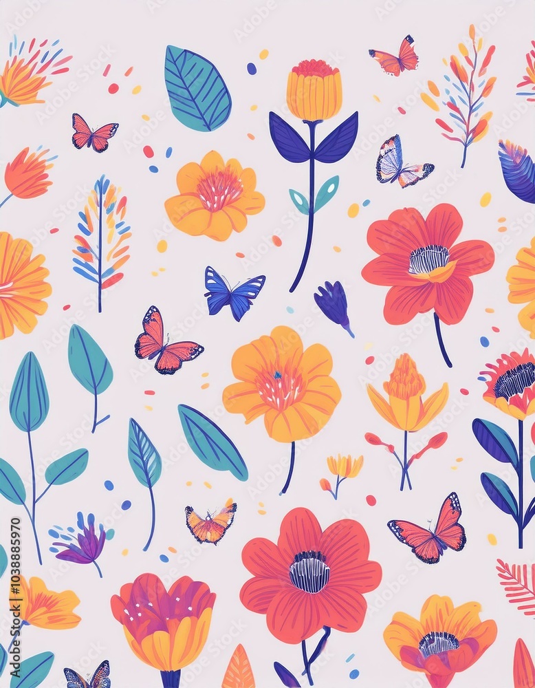 Seamless vector pattern of beautiful pink spring flowers, butterflies, and leaves, perfect for vintage floral summer design illustrations