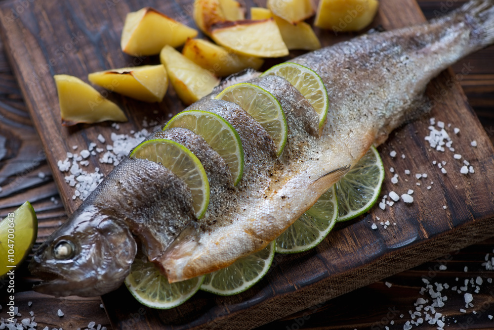 Baked trout fish with lime and potato in a rustic wooden setting