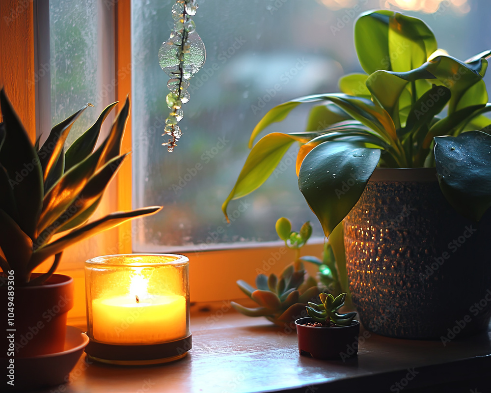 Serene Moment Captured With Glowing Candle Beside Lush Wallpaper Mural - Decorly Solutions | Decorly Solutions