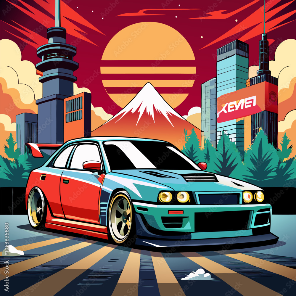 Retro 80s Purple Sports Car Cityscape Vector Illustration - Sunset Tokyo Tower.