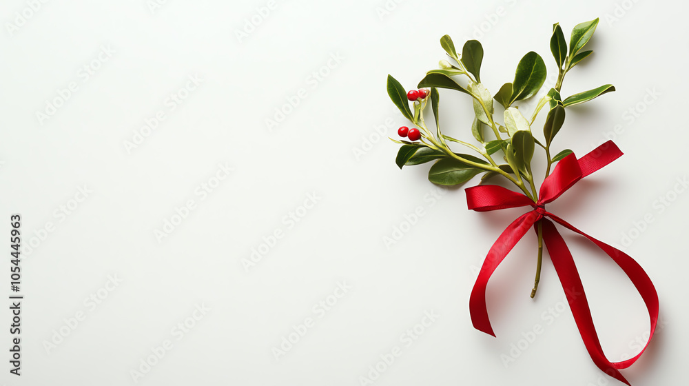 Traditional mistletoe tied with a red ribbon on a plain white background, isolated festive decoration