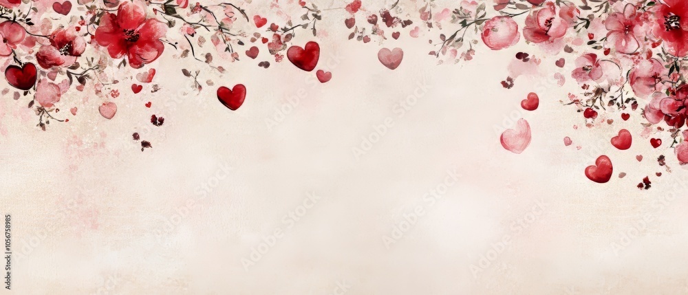 Design a romantic copy space background for Valentine's Day, featuring soft pink and red hues, delicate hearts, and elegant floral accents, creating the perfect canvas for heartfelt messages of love