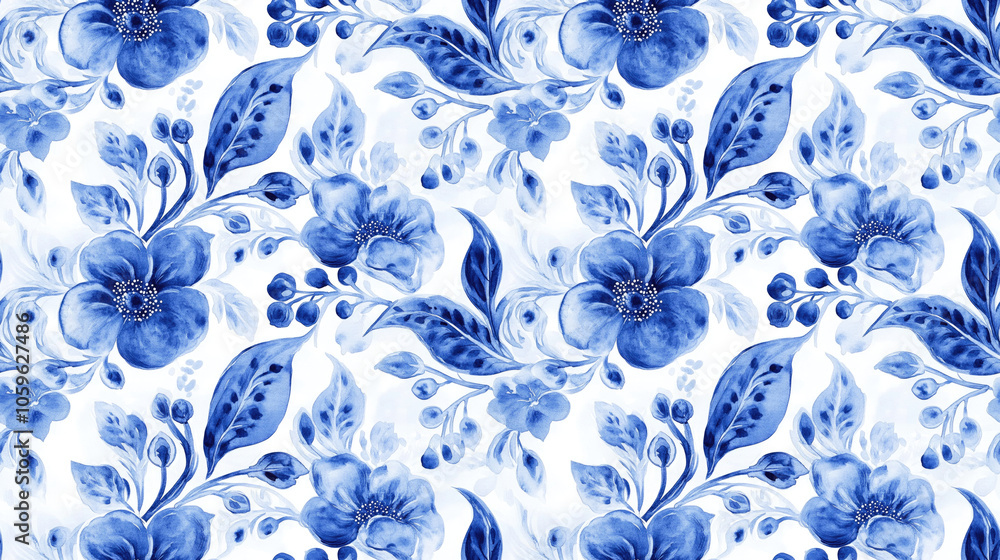 Blue and White Watercolor Floral Tile Pattern
