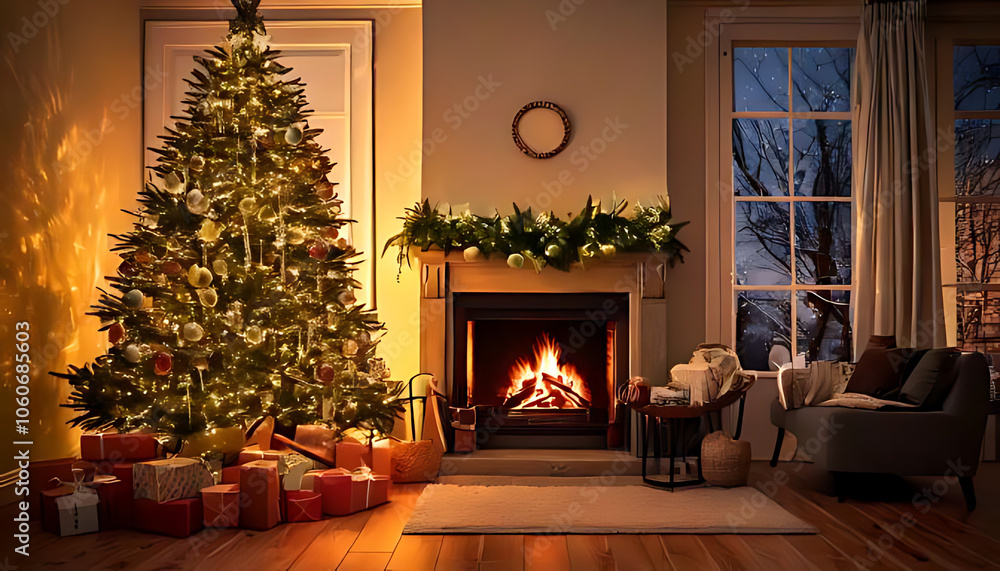 Cozy Christmas Living Room: A beautifully decorated Christmas tree illuminates a warm living room, surrounded by festive decorations and the inviting glow of a fireplace.