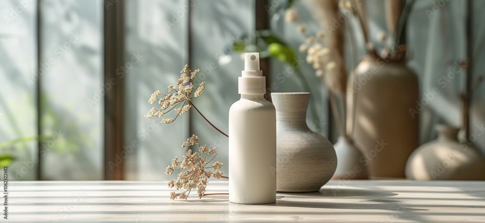 White Spray Bottle In Elegant Natural Setting Wallpaper Mural - Decorly Solutions | Decorly Solutions