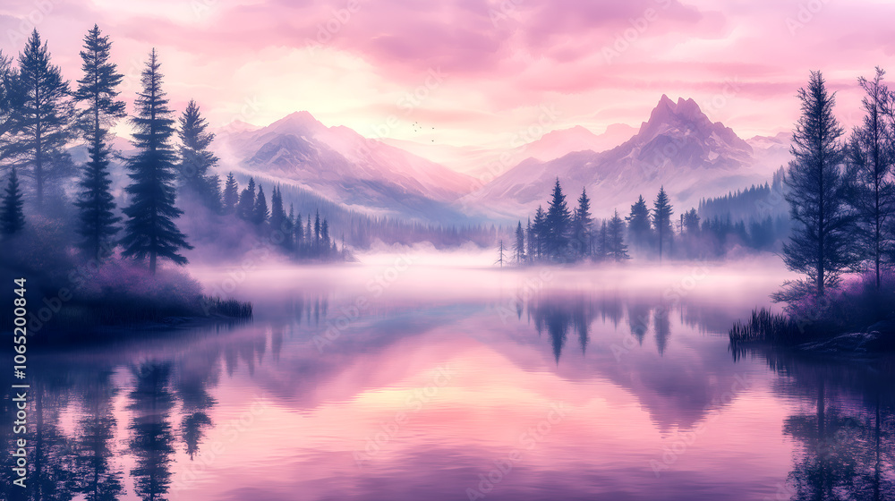 Mountain Lake At Sunrise With Mist And Pink Wallpaper Mural - Decorly Solutions | Decorly Solutions
