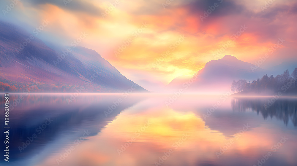 Tranquil mountain lake at sunrise with soft pastel colors cr Wallpaper