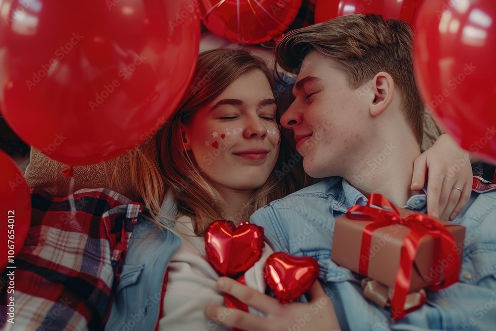 Emotional Couple Celebrating Together With Gifts And Heart-shaped Wallpaper Mural - Decorly Solutions | Decorly Solutions