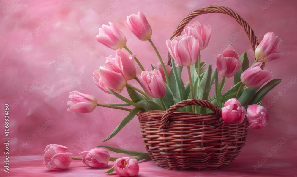 Basket Of Pink Tulip Flowers On A Pink Spring Background