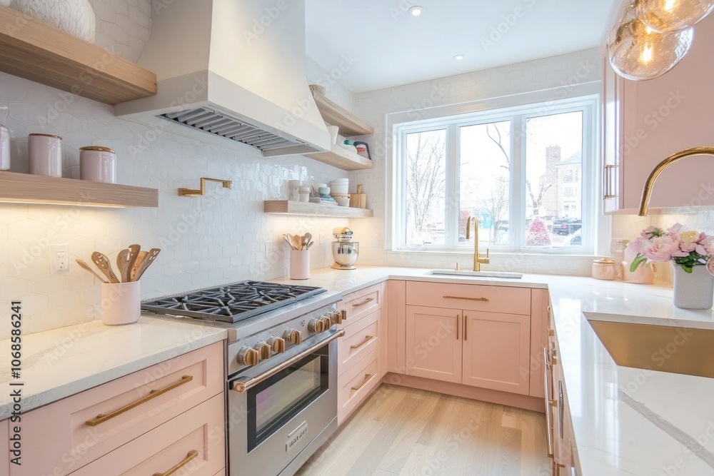 Modern Kitchen With Blush Pink Cabinets Gold Accents Wallpaper Mural - Decorly Solutions | Decorly Solutions