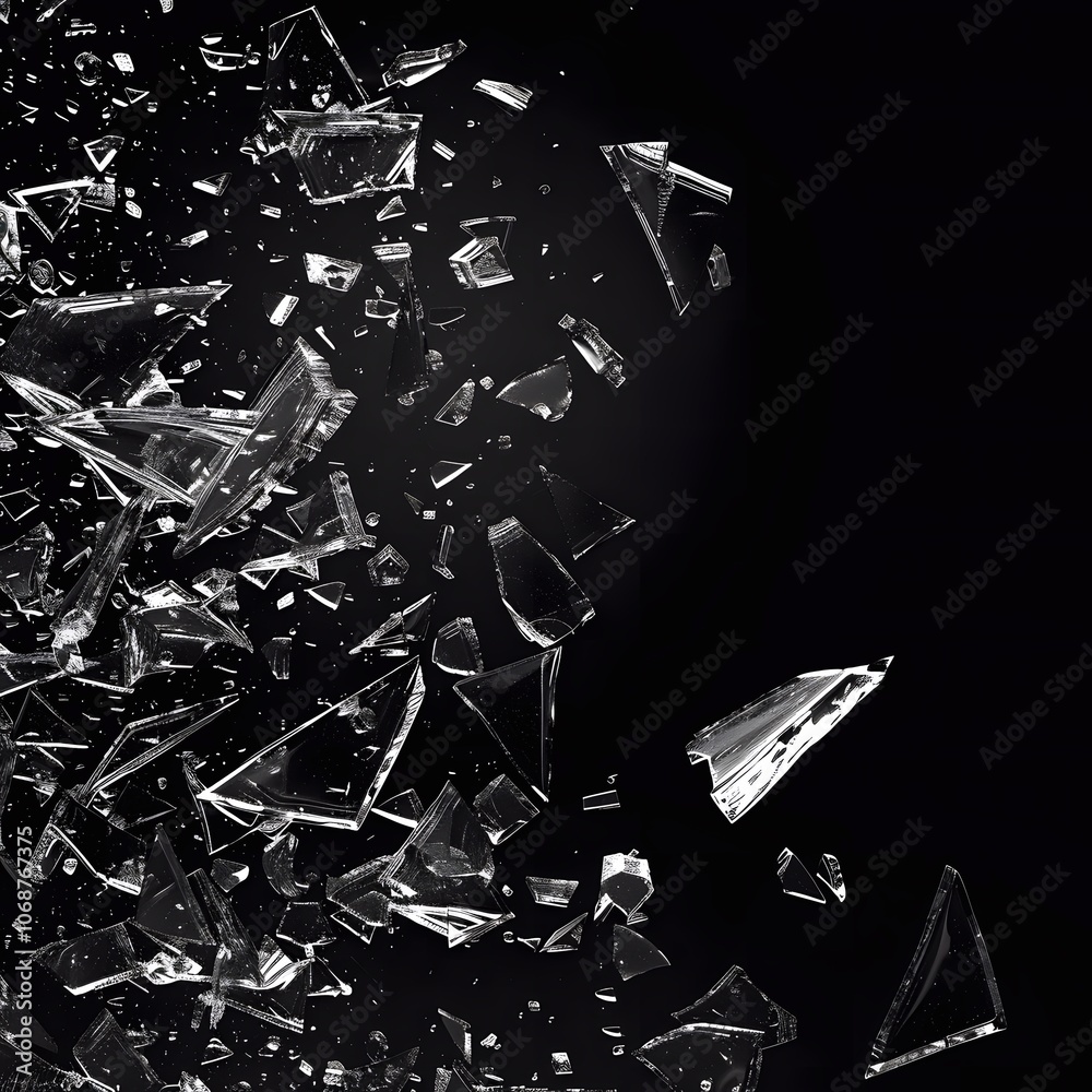 Dynamic glass texture featuring shattered pieces with bits and shards exploding in the air. Black backdrop contrasting with the fragments of broken glass pieces. Blur and bokeh motion effect.