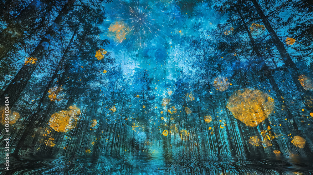 Stunning forest scene with vibrant blue hues and golden orbs Wallpaper