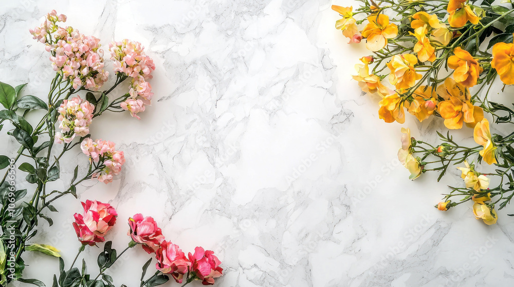 Beautiful arrangement of pink and yellow flowers on marble b Wallpaper