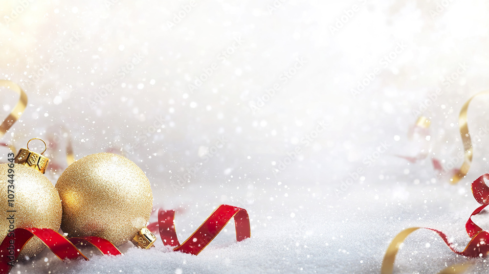Festive Ornaments with Snow and Dazzling Bokeh Lights Background