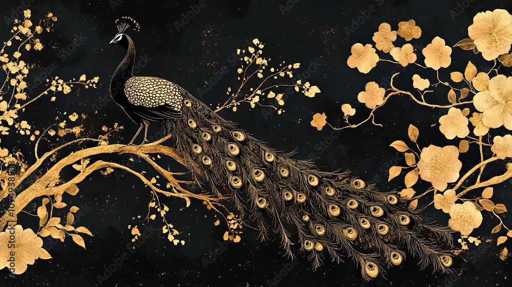 Golden Peacock Perched on Branch with Flowers Wallpaper