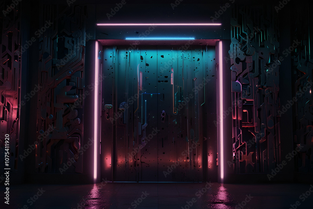 3D technology abstract neon light background, empty space scene, spotlight, dark night, virtual reality, cyber futuristic sci-fi background, street floor studio for mock up. Colored geometric.