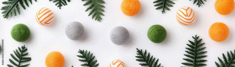 Colorful handmade wool balls surrounded by fern leaves creat Wallpaper