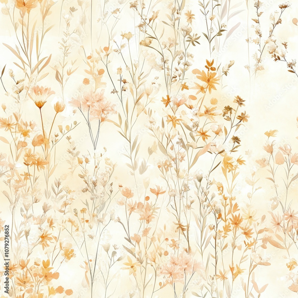 Golden wildflowers watercolor seamless pattern. Soft, dreamy, and delicate floral design