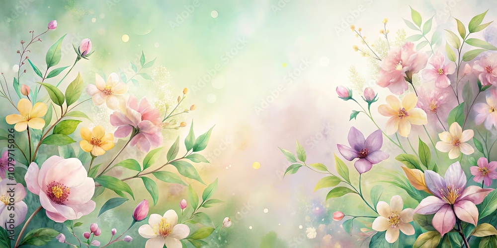 Serene Botanical Illustration Featuring Delicate Floral Arrangements and Lush Greenery on a Soft Watercolor Background
