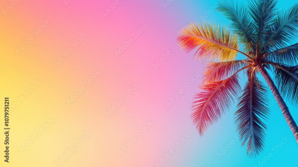 A single palm tree standing tall against a backdrop of a vibrant sunset gradient, representing tranquility and tropical vibes in a stunning color palette.