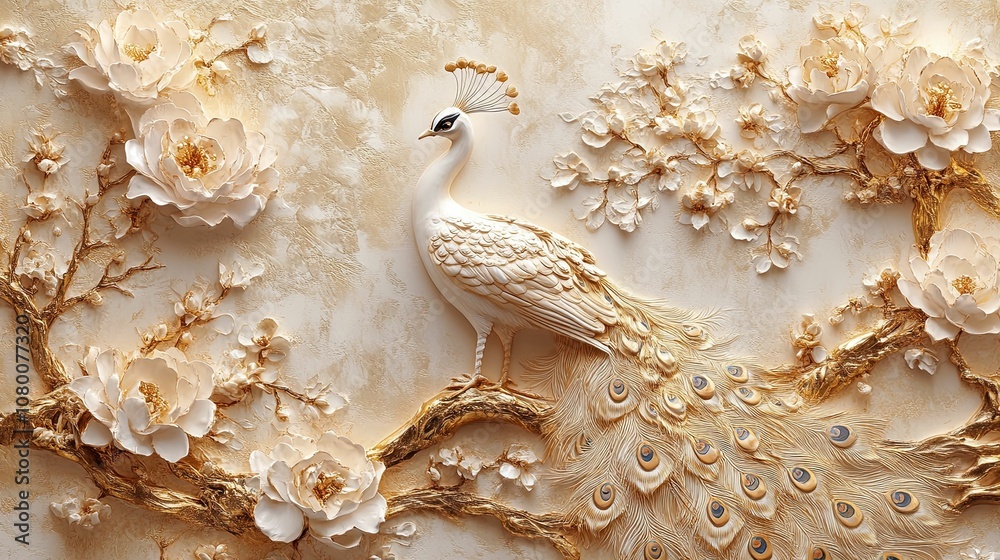 White Peacock In A Golden Branch With White Wallpaper Mural - Decorly Solutions | Decorly Solutions
