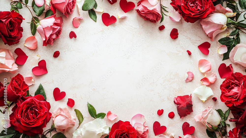 Pink and red roses create a lovely frame around a beige background, interspersed with small decorative hearts. Perfect for Valentine's Day or romantic occasions.