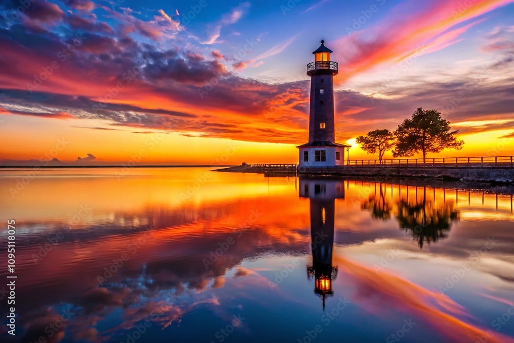 Serene Sunset Illumination A Coastal Lighthouse Reflecting Golden Hues in Calm Waters