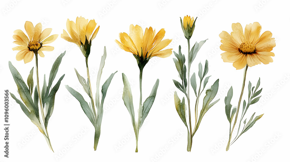Watercolor Painting Of Yellow Flowers With Green Leaves Wallpaper Mural - Decorly Solutions | Decorly Solutions