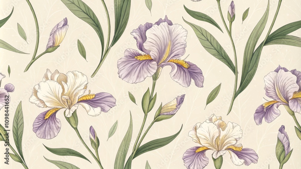 Botanical Iris Seamless Pattern Watercolor And Ink Illustration Wallpaper Mural - Decorly Solutions | Decorly Solutions
