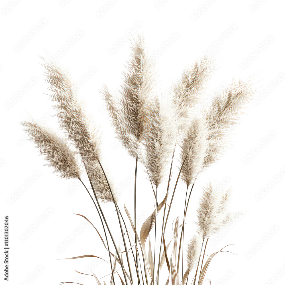 Close-up of Delicate Beige Pampas Grass Stalks Isolated on White Background