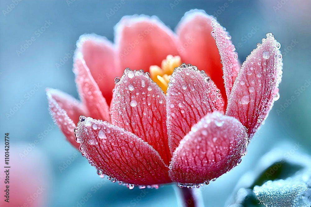Delicate pink tulip coated in frost crystals glistening in soft, cold light, embodying winter's serene beauty